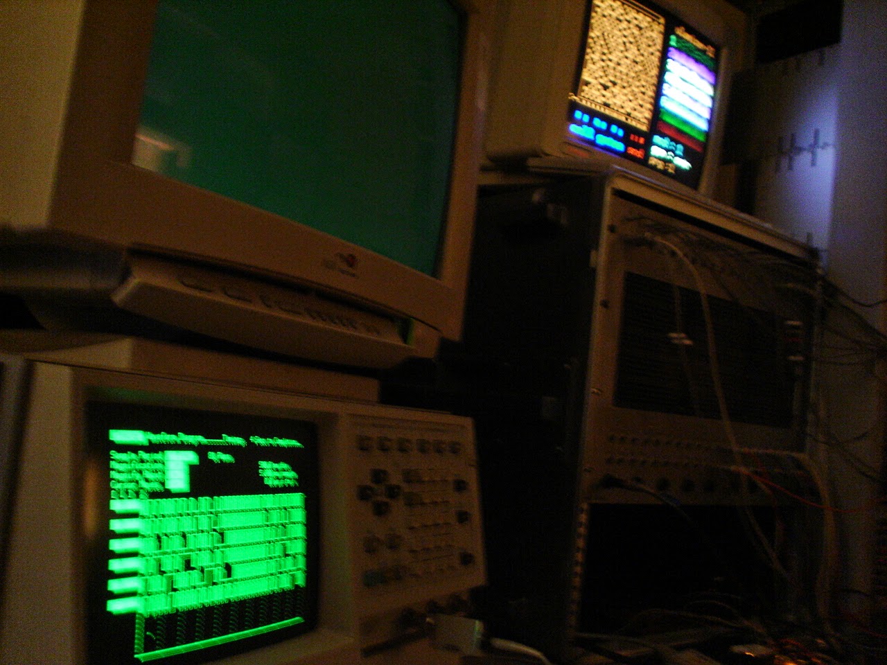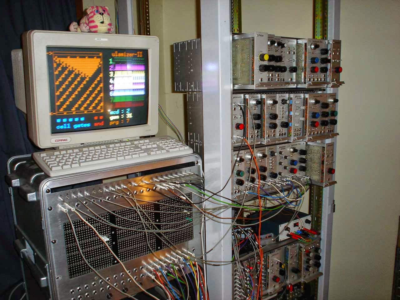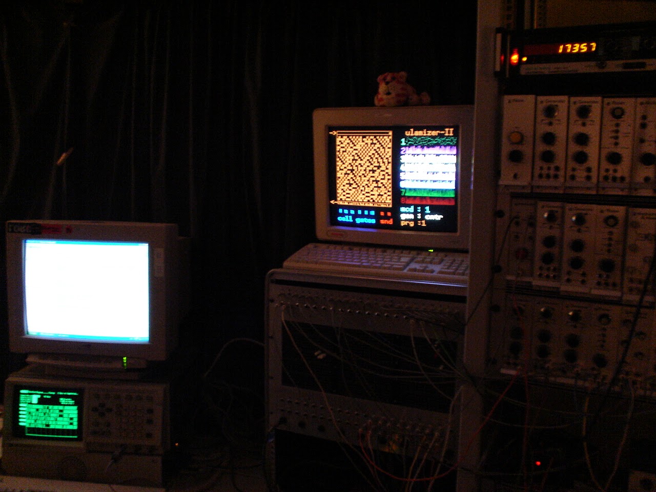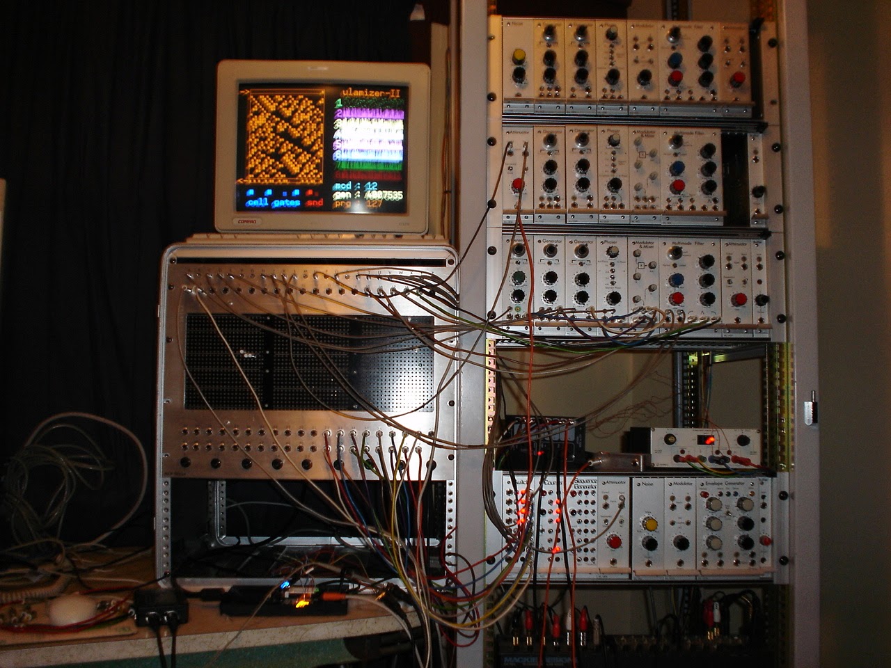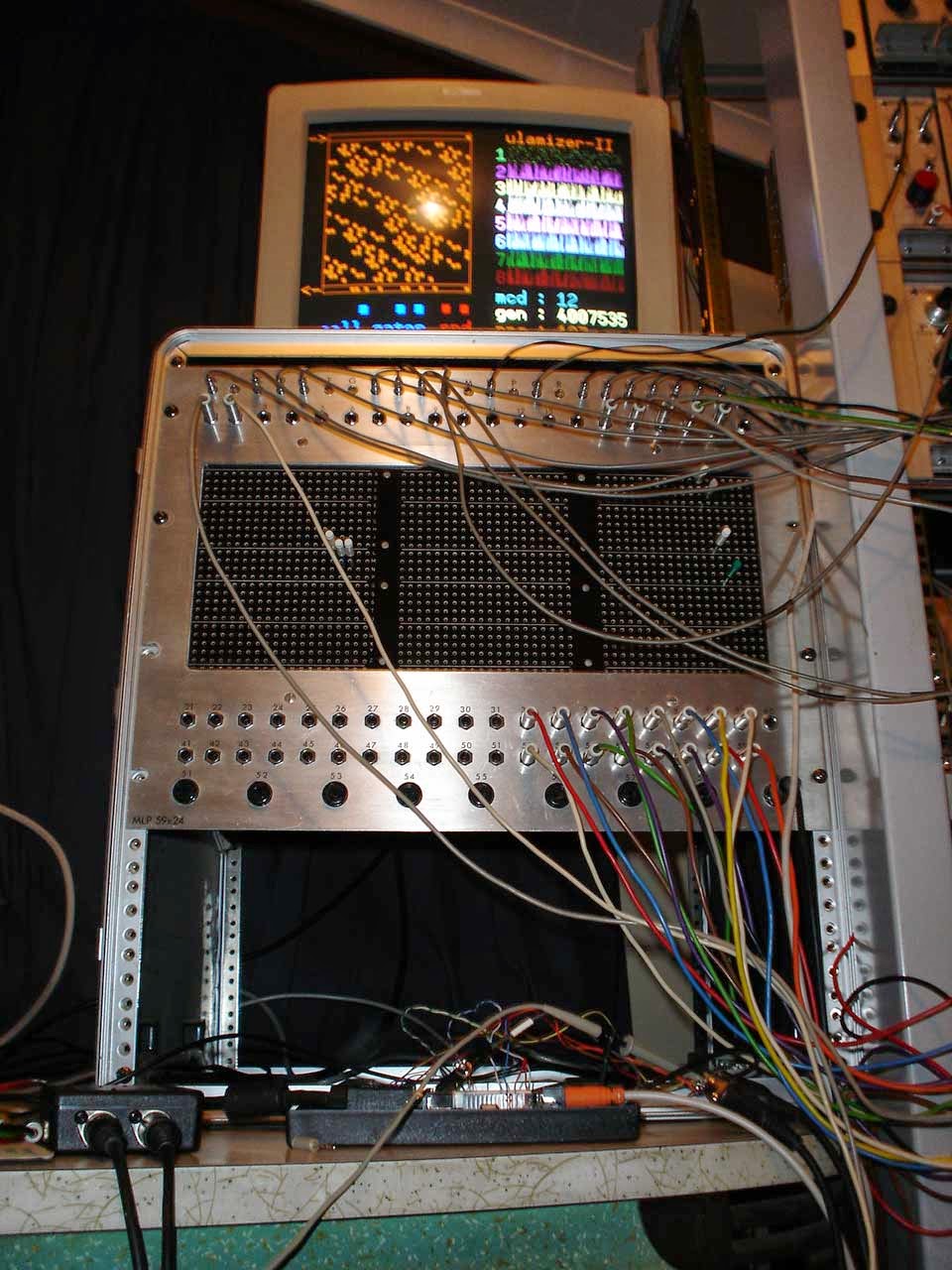The pictures below are from my studio in the Blue Mountains, Australia back in 2006/7. The main modular synth seen in this setup is my Hinton Music Lab Modular. The Hinton Music Lab is particular suited to my CA module tests as it has a completely unique 8 bit logic bus that connects its sequencer, switch and counter modules together, so I can drive that bus directly from the cell gate outputs. The Ulamizer II guts are in the black box & another small circuit board hanging off that in the flightcase under the Hinton Pin Matrix.